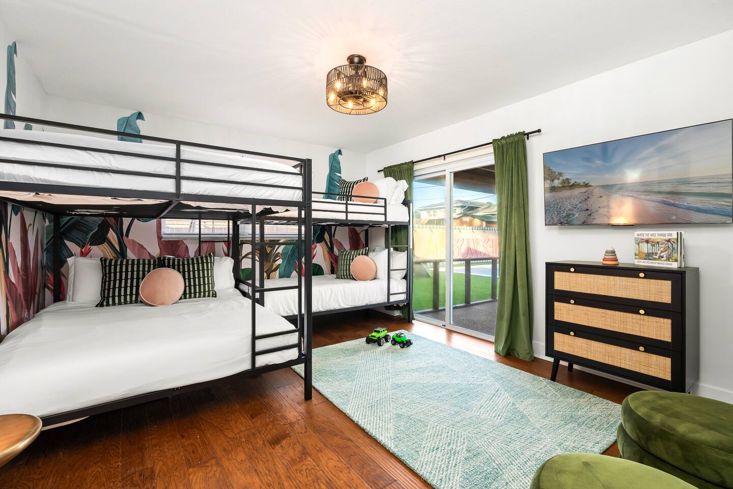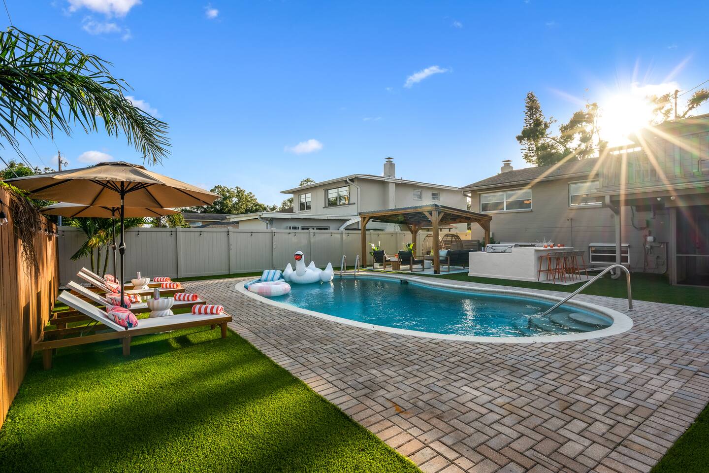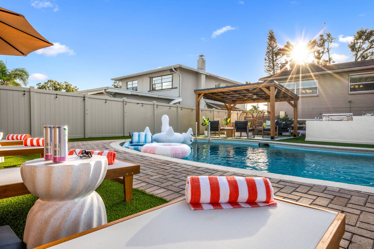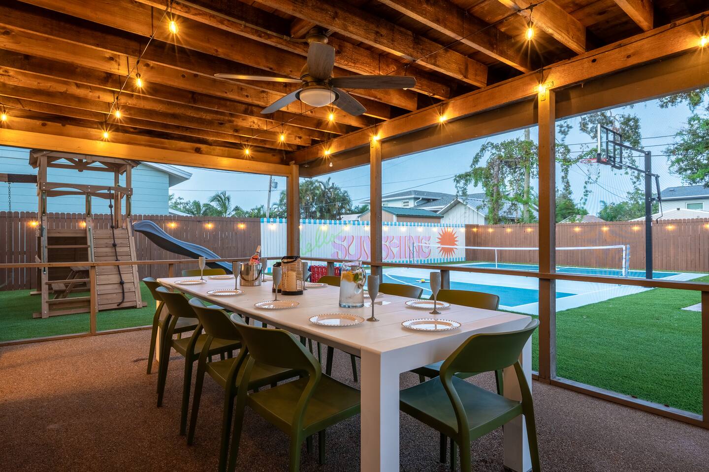 ✨ Thoughtfully designed across multiple levels, Casa Palmera offers room for everyone to unwind together or recharge in their own corner. 🛏 SLEEPING ARRANGEMENTS Four serene king bedrooms plus a playful bunk suite — all with smart TVs and luxe bedding for a restful wind-down: • King Suite 1 – spacious + calming • King Suite 2 – soft, relaxing retreat • King Suite 3 – light-filled + peaceful • King Suite 4 – tranquil hideaway • Bunk Suite – queen/queen + twin/twin (kid-favorite hangout) 🎤 ENTERTAINMENT & GATHERING SPACES • Game room with karaoke stage, billiards & shuffleboard • Open-concept chef's kitchen, dining, and living area • Upstairs deck with canopy-covered daybeds — ideal for morning coffee, a quiet read, or stargazing 🌿 OUTDOOR HIGHLIGHTS • Heated pool with shaded loungers • Twilight Cinema Lounge — pergola with outdoor theater + gas fire pit • Outdoor kitchen with grill & bar for poolside dining • Private pickleball & basketball court • Mini-golf + lawn games • Kids’ play gym & picnic spot 👶 FAMILY-FRIENDLY • High chair, toddler table, pack ’n play, toys & books • Beach-ready kit: chairs, umbrella, cooler, boogie board & sand toys • Curated board games 📍 LOCATION • 5 min → Indian Shores Beach • 10–12 min → Indian Rocks & John’s Pass • 20 min → Clearwater Beach & St. Pete Beach • Near local restaurants, ice-cream shops & family activities