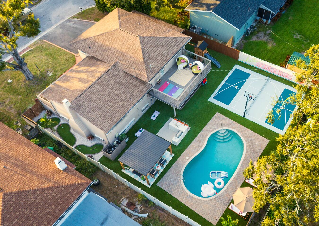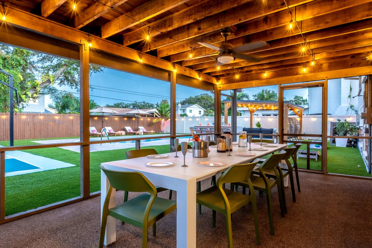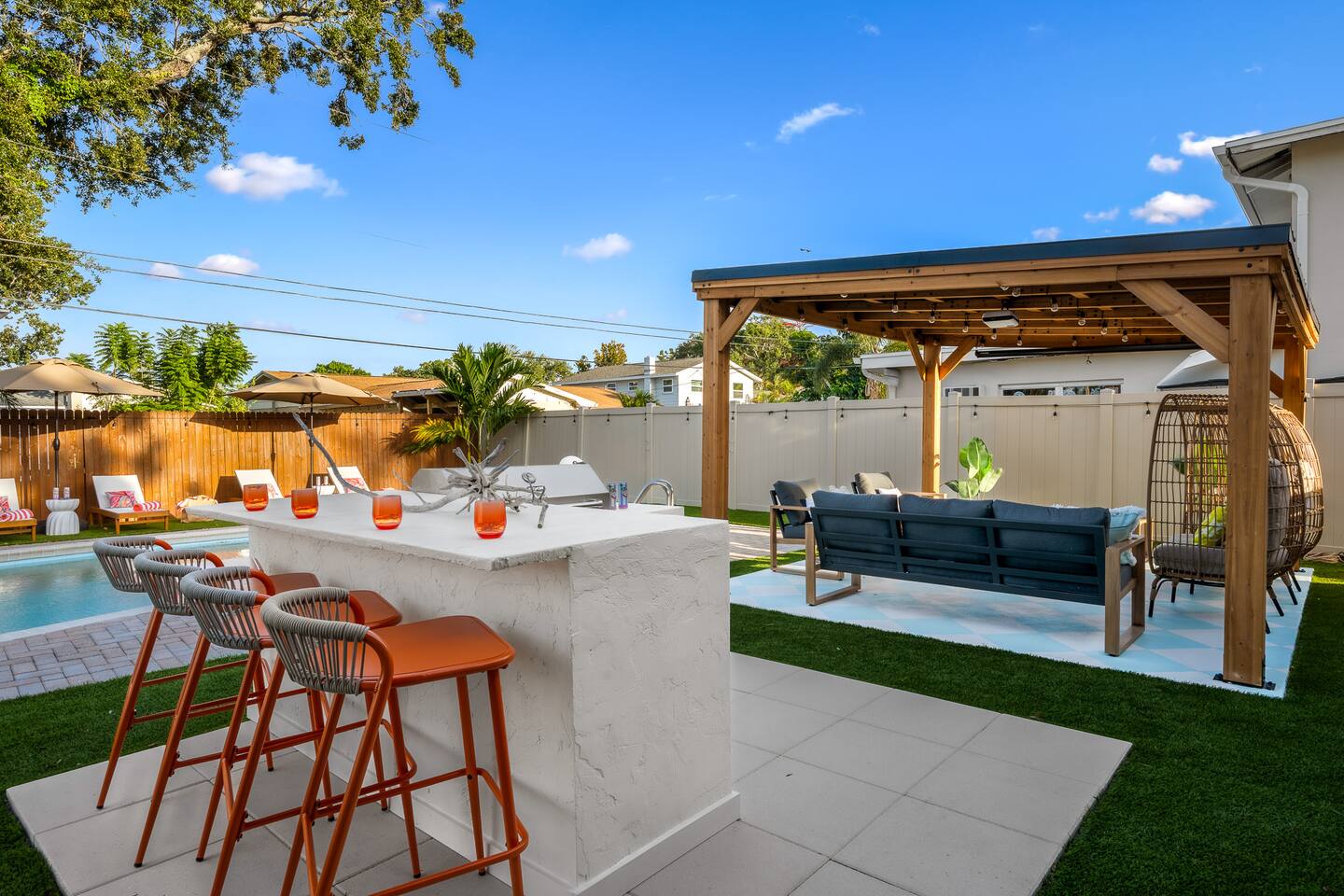✨ Thoughtfully designed across multiple levels, Casa Palmera offers room for everyone to unwind together or recharge in their own corner. 🛏 SLEEPING ARRANGEMENTS Four serene king bedrooms plus a playful bunk suite — all with smart TVs and luxe bedding for a restful wind-down: • King Suite 1 – spacious + calming • King Suite 2 – soft, relaxing retreat • King Suite 3 – light-filled + peaceful • King Suite 4 – tranquil hideaway • Bunk Suite – queen/queen + twin/twin (kid-favorite hangout) 🎤 ENTERTAINMENT & GATHERING SPACES • Game room with karaoke stage, billiards & shuffleboard • Open-concept chef's kitchen, dining, and living area • Upstairs deck with canopy-covered daybeds — ideal for morning coffee, a quiet read, or stargazing 🌿 OUTDOOR HIGHLIGHTS • Heated pool with shaded loungers • Twilight Cinema Lounge — pergola with outdoor theater + gas fire pit • Outdoor kitchen with grill & bar for poolside dining • Private pickleball & basketball court • Mini-golf + lawn games • Kids’ play gym & picnic spot 👶 FAMILY-FRIENDLY • High chair, toddler table, pack ’n play, toys & books • Beach-ready kit: chairs, umbrella, cooler, boogie board & sand toys • Curated board games 📍 LOCATION • 5 min → Indian Shores Beach • 10–12 min → Indian Rocks & John’s Pass • 20 min → Clearwater Beach & St. Pete Beach • Near local restaurants, ice-cream shops & family activities